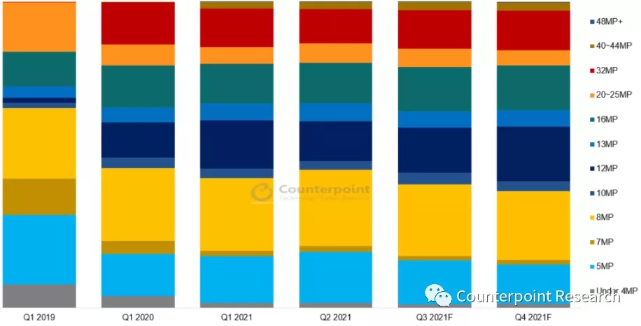 一起,因为商场对低端智能手机的需求微弱,2021年第二季度8MP及以下像素的销量比例增至45.2%,其间5MP和8MP算计占到总销量的41.7%。